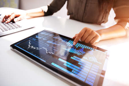 Close-up Of A Businesswoman's Hand Analyzing Graph On Digital Laptop At Workplace