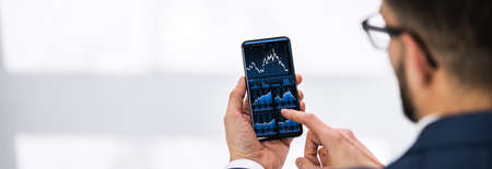 Close-up Of A Stock Market Broker Using Mobile Phone With Graph On Screen