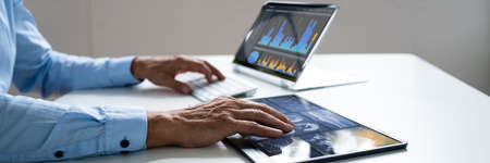 An investor is looking at stock charts on mobile phones and tablets, he is a stock investor, he trades stocks by analyzing the charts and using indicators to enter trades. Stock investment idea.