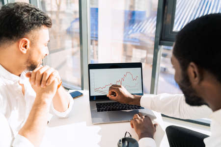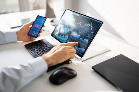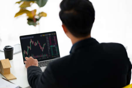 Businessmen work with stock market investments using laptops to analyze trading data. desktop computer with stock exchange graph on screen. Financial stock market. Analyzing data in office background.