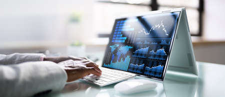 working modern computer dashboard analyzing finance sales data, planning ,strategy, Stock market, Business growth, progress, success concept. trader growing virtual hologram stock, invest in trading.