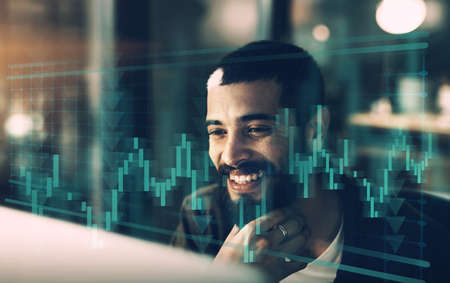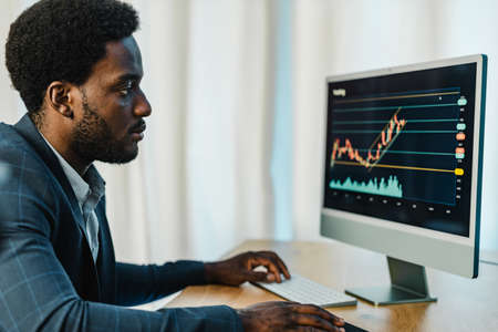 Young money businessman sitting staring at a computer screen displaying a cryptocurrency featuring stock tickers or graphs. Stock trading platform concept. professional financial advisor.