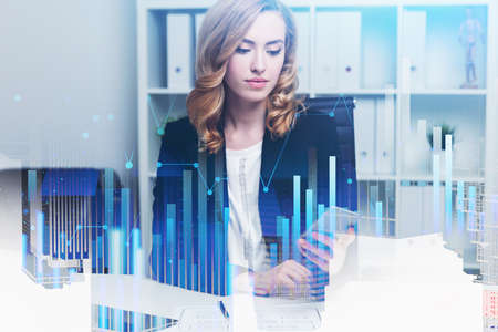 Serious young businesswoman working in blurry office with double exposure of financial graphs. Concept of stock market. Toned image