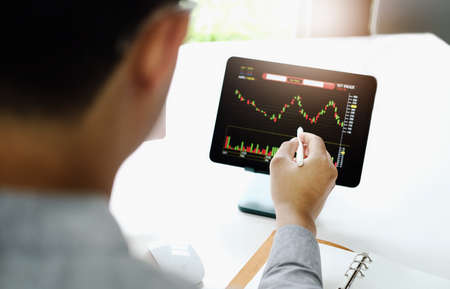 Stock investor holding a pen pointing a tablet screen that opens a stock chart program to read stock price charts, analyze purchases. Cryptocurrency stocks are popular with both new and old investors.