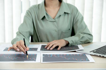Trader businesswoman analyze stock graph and report, set targets for online forex trading market management success.