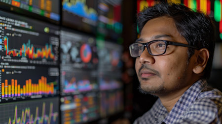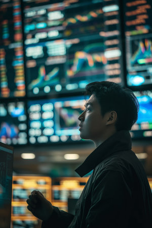 Young Professional Analyzing Market Trends in HighTech Trading Office Environment.
