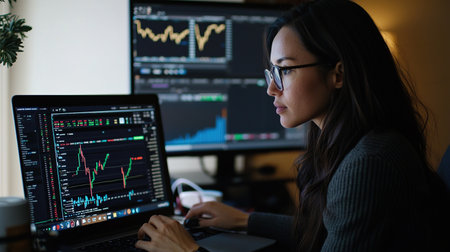 Focused young woman analyzes stock market data on her laptop in a modern office