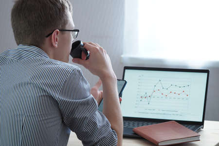 Investments, exchanges, quotes. One businessman working on laptop with cup of coffee. Cropped image