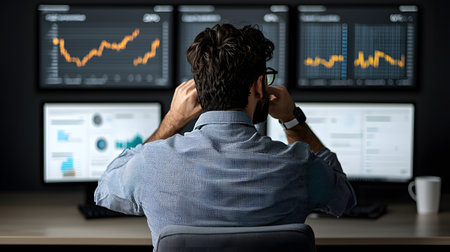 An Individual Analyzes Financial Market Data on Multiple Screens in a Modern Trading Room Environment During Late Afternoon Hours. Generative AI