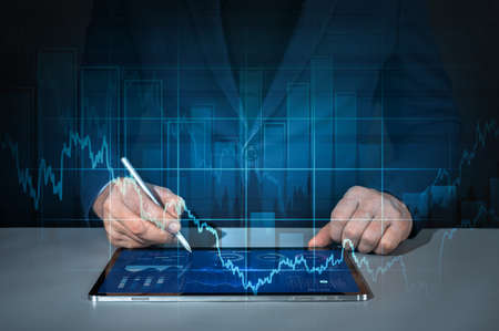 Follow stock prices, stock quotes and the rise and fall of the cryptocurrency on a mobile tablet. The hand draws on the tablet screen using a stylus. close-up small depth of field