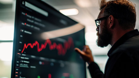 A focused male trader intensely analyzes stock market charts on a digital screen, showcasing the dynamic environment of modern financial analysis and investment strategies.