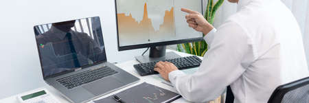 Close up shot of brokerage company professional agent analyzing real time trading charts to predict market trend. Forex stock trader sitting in front of multi monitor workstation.