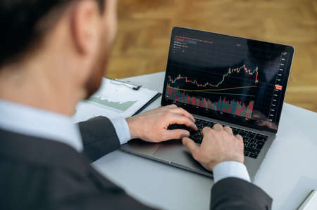 Caucasian businessman trading online, using computer technology, looking on stock exchange trade and analyzing