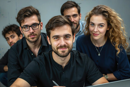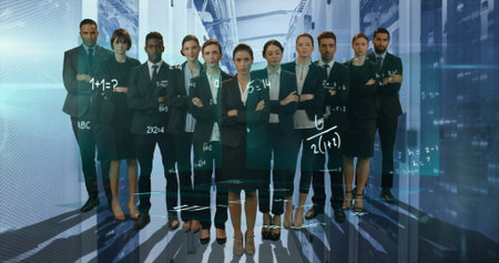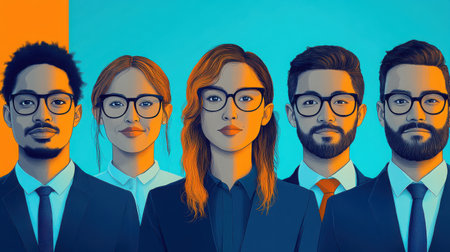A diverse group of business professionals stands in a modern office, dressed sharply in suits, looking confidently towards the camera during an important gathering.