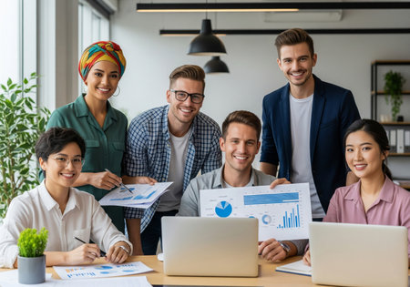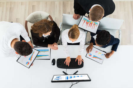 Group Of Multiracial Businesspeople Working On Graphs In Office