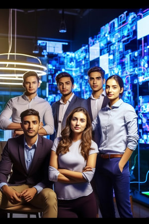 A team of young multinational business people are working on a startup. New generation of startups. communication network. Management strategy. Digital transformation. multinational professional staff