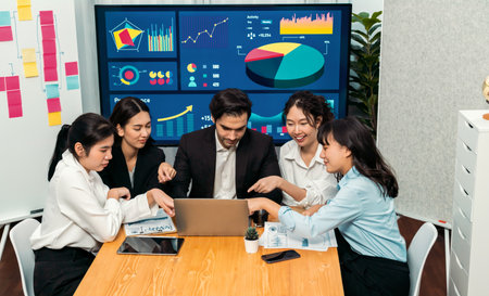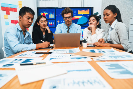 Diverse group of business analyst team analyzing financial data report. Finance data analysis chart and graph dashboard show on TV screen in meeting room for strategic marketing planning. Meticulous