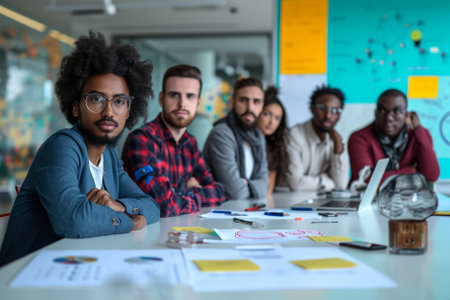 Diverse group of aspiring entrepreneurs with puzzled expressions in a modern meeting room. AI generative