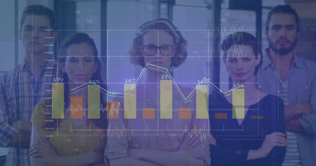 Image of financial data processing over diverse business people in office. Global finance, business, connections, computing and data processing concept digitally generated image.