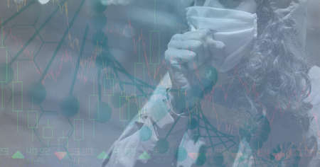 Digital illustration of data, statistics and graphs, macro Covid-19 cell over Caucasian male scientist wearing protective clothes. Coronavirus Covid-19 pandemic concept digital composite