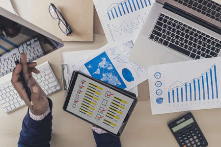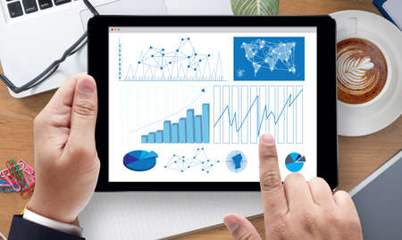 Business Research Data Economy , on the tablet pc screen held by businessman hands - online, top view