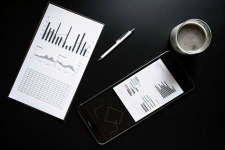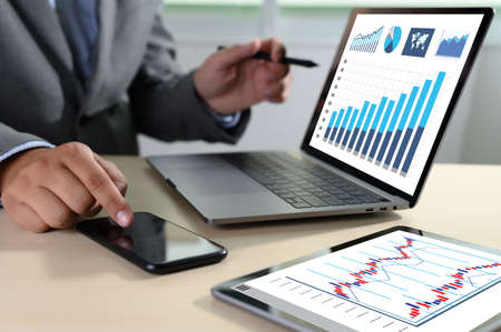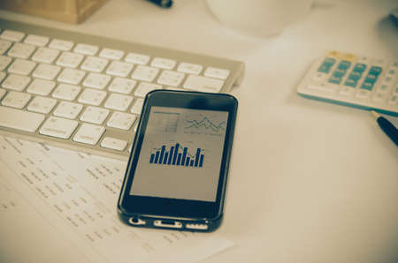 Smartphone and Tablet pc with financial charts and graphs on office desk, business concept