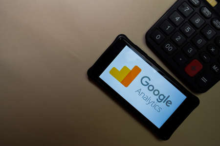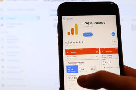 Los Angeles, California, USA - 27 November 2019: Google Analytics app icon on mobile phone screen with blurry website on laptop, Illustrative Editorial.