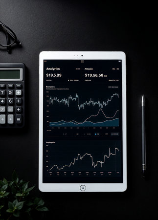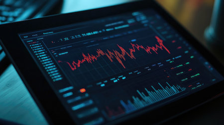 Detailed shot of a stock chart with market trends and performance metrics displayed on a tablet or laptop