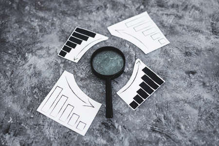 financial markets or money and investments conceptual image, magnifying glass with charts showing upward and downward trends