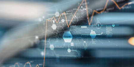 Conceptual business dashboard for financial data analysis . 3D render computer graphic .