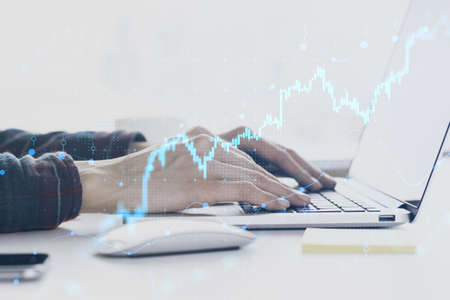Forex market growth, analyzing financial data and financial strategy concept with human hands typing on laptop keyboard and virtual digital stock market chart