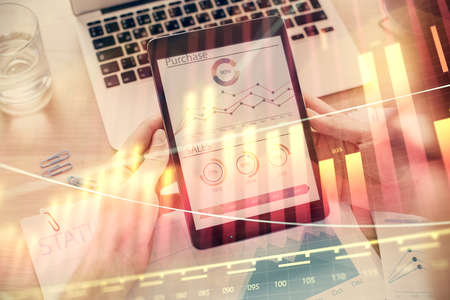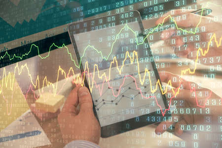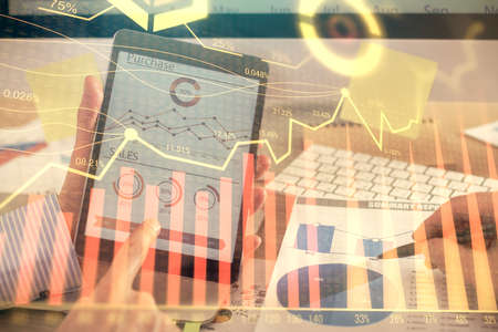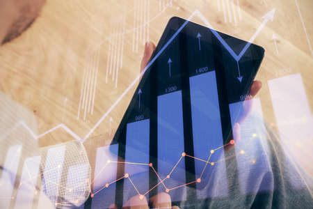 Double exposure of mans hands holding and using a digital device and forex graph drawing. Financial market concept.