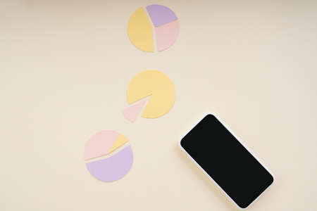 Smartphone and circle diagram colorful infographics. Business statistic, diagram, data visualization, graph information. Top view.