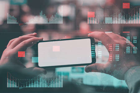 Trader holding in the hands a smart phone and researching stock market to proceed right investment solutions. Internet trading and wealth management concept. Hologram Forex chart over close up shot.