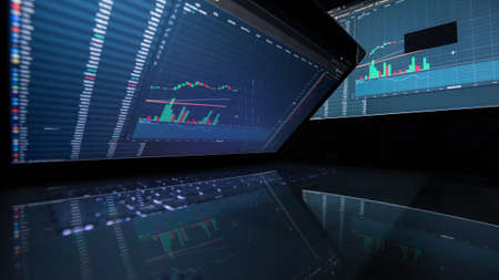 Laptop screen with stock market charts. Technical analysis and fundamental indicators of stock quotes in the trading terminal. Japanese candlesticks and company tickers.