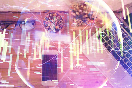 Double exposure of forex graph hologram over desktop with phone. Top view. Mobile trade platform concept.
