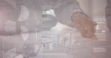 Image of statistics and financial data processing over architect in meeting. global business, connections and data processing concept digitally generated image.