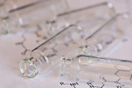 A closeup of glass ampules or ampoules in glass stand with a dark background