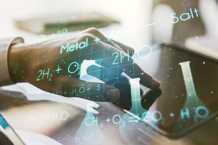 Creative chemistry hologram and hand working with a digital tablet on background, pharmaceutical research concept. Multiexposure