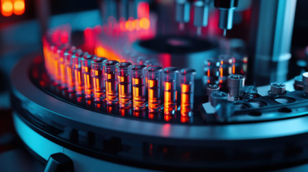 Biochemical analyzer with small glass test tubes, laboratory environment