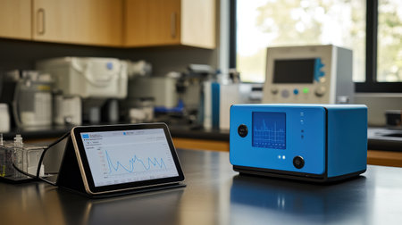 A vibrant blue medical device sits on a laboratory table next to a tablet, displaying data analysis graphs. This modern setup highlights technology in healthcare.