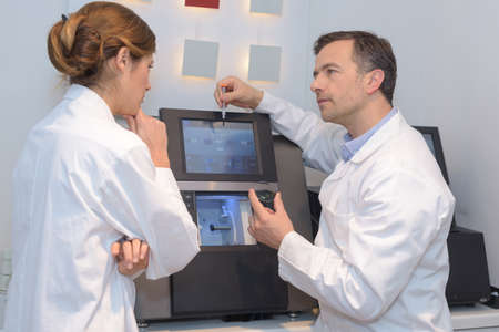 Laboratory technician test blood in automatic blood sample analyzer