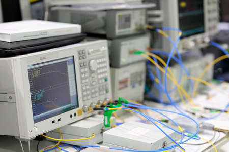 Fiber optic communication laboratory with modern measuring equipment. Selective focus.