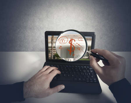 A person examining property photos through a magnifying glass, symbolizing home evaluation