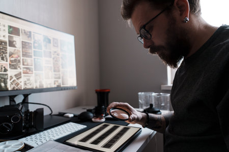 Close-up hands and objects for photographer work. Laptop, loupe and photo films. Concept of occupation, job, education