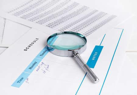 Single Magnifying Glass with Black Handle, Leaning on the financial data. Concept of Business and Finance research .