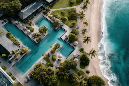 Aerial view of luxury resort with infinity pool and oceanfront beach.