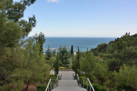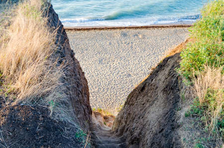 Mountain path on the rocky shore of the turquoise sea. Cape Fiolent, Sevastopol