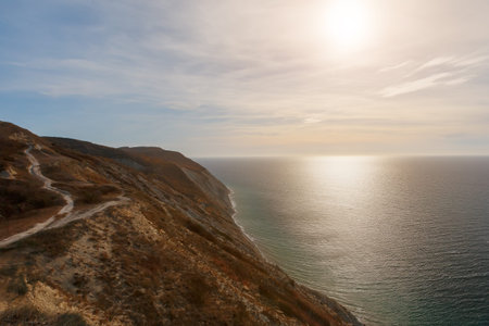 Beautiful sunset view on the sea coast from the top of the hill. Black Sea. Anapa, Krasnodar region.
