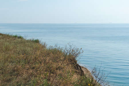 Green grass on cliffs on the Black Sea coast. Landscape of cliffs and beach in Vama Veche, Dobrogea region, Romagna. Nature and traveling concept.